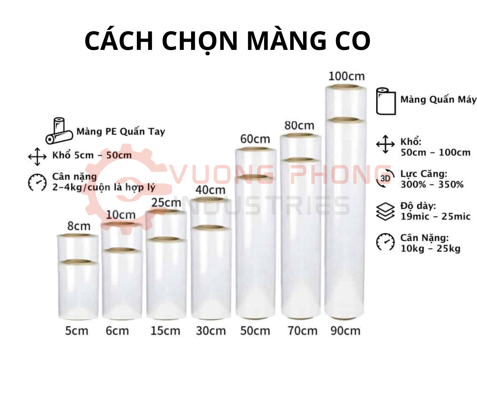 Màng co PE rất nhiều kích thước sau đây là một số các kích thước tiêu biểu hay được sử dụng trong công nghiệp và các chọn màng co quấn tay/quấn máy